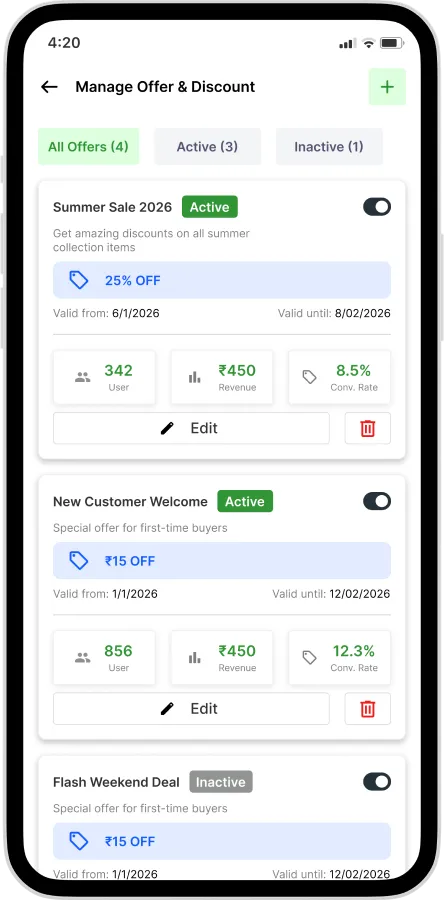 Create promotional offers, discount coupons, and special deals to increase user engagement and sales.